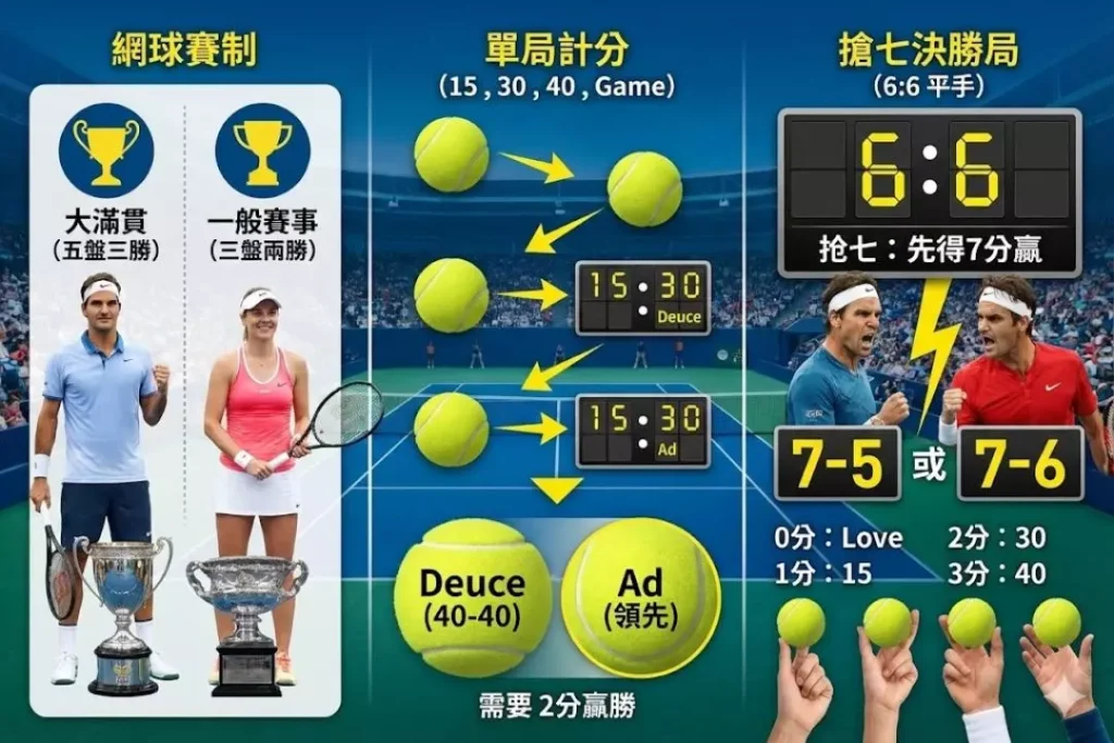 若今天網球出現和局的話,則是搶七的決勝局,這裡就是需要領先7分且領先2分贏,簡單來說就是單雙方6:6的時候需要先德7分且領先2分才是勝利,通常是三盤兩勝或五盤三勝制。