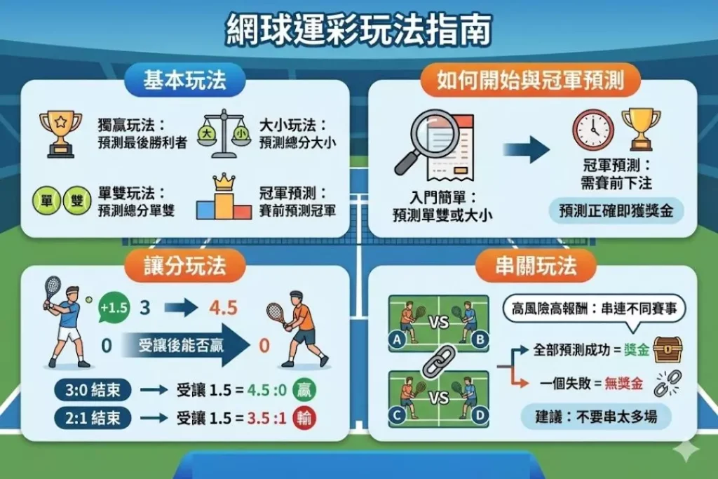 網球運彩怎麼玩?首先需要知道這些玩法,像是上述這些玩法都是比較基本且簡單,只需要預測比賽的單雙或者大小即可,像是冠軍預測這種玩法,則是需要賽事開打前下注,賽事開打前我們可以先預測這次賽事誰可以獲得冠軍,只要最終冠軍跟你預測人選相同即獲得預測獎金。