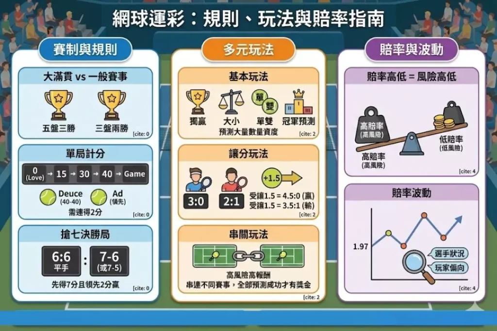 網球運彩怎麼玩?首先我們需要知道的就是相關的網球規章,像是網球大滿貫還是一般賽事都會有不同,部分賽事是三盤兩勝,而大滿貫賽事則會變成五盤三勝制度,這些都會有不同的下注方式,所以以下才先告訴你網球運彩規則,這樣才可以更快速理解網球運彩怎麼玩。