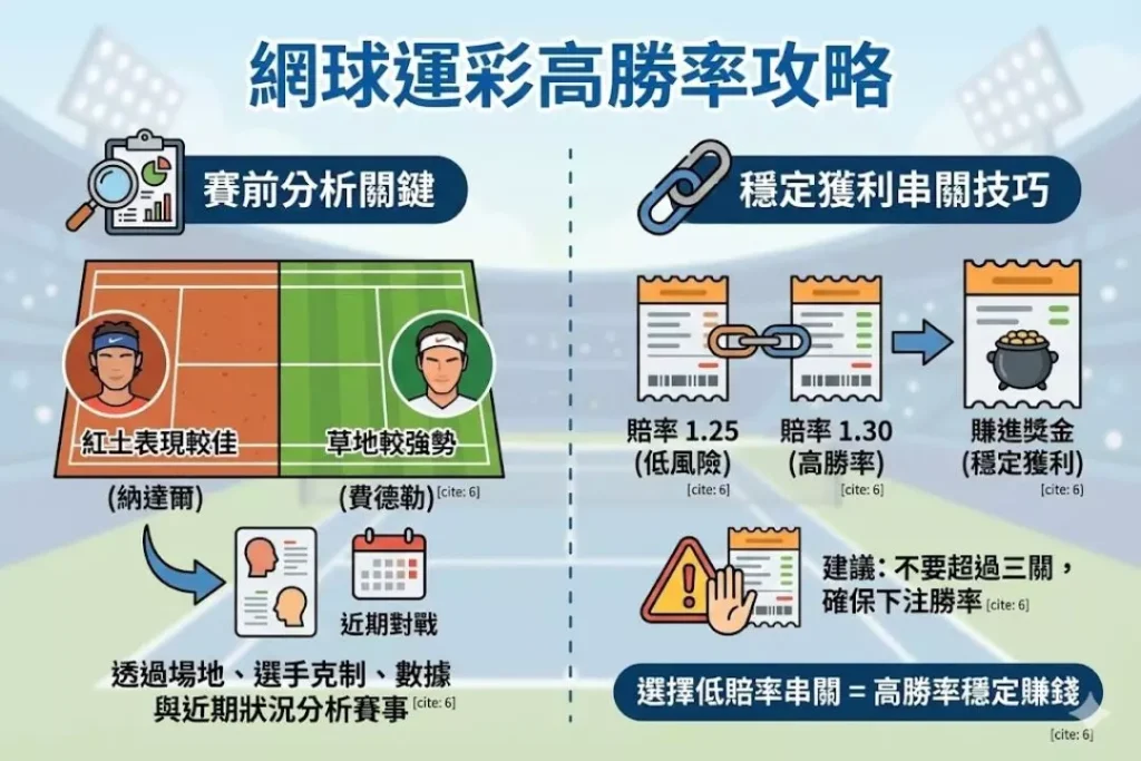 網球運彩怎麼玩才可以有比較高的勝率,首先我們需要知道的就是場地、選手克制、數據等等條件讓你去分析賽事,再者就是可以透過串關來穩定賺錢,前面比較偏向數據分析,後者比較偏向於投機取巧,主要還是看你是想要賺獎金還是要參與感,根據不賽事就會有不同分析!